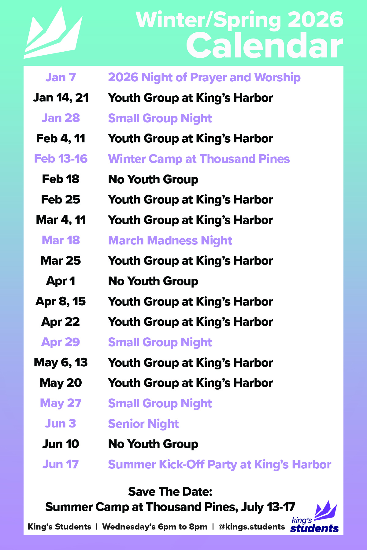Every Wednesday from 6-8pm, we gather our students to help reset and refocus on Jesus. Through singing worship songs together, a Bible-based message, and small group discussions, students have the opportunity to build authentic friendships that are rooted in Christ and help them build habits that grow their faith. And because having fun together is a big part of who we are, students can expect to have a blast every week!